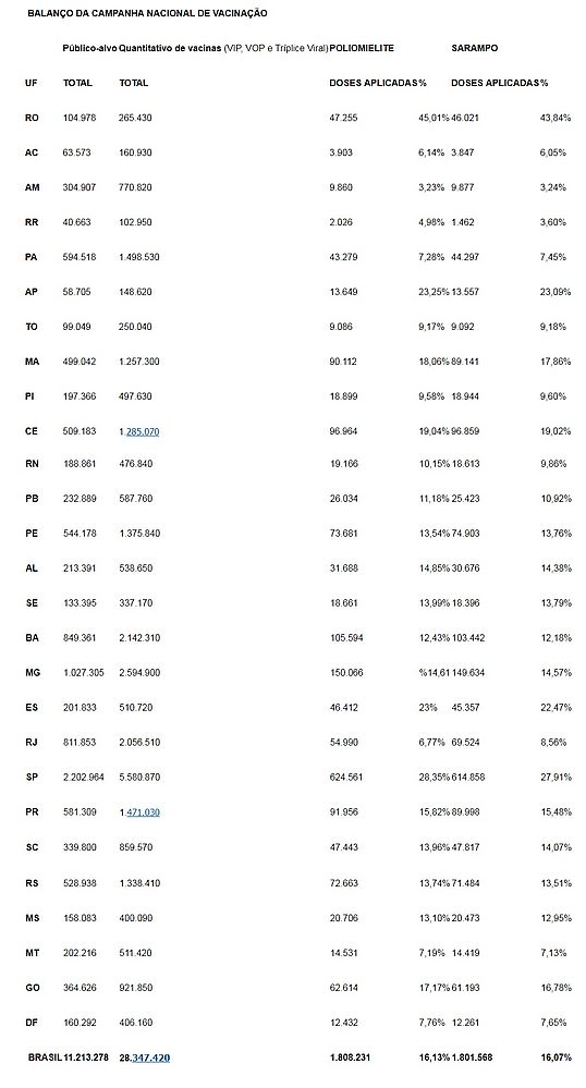 Nesse sábado, Dia D da campanha, o Ministério da Saúde divulgou como estava o balanço da vacinação em todos os estados e os números ainda são baixos. Em Alagoas, só 14% do público-alvo havia sido imunizado até ontem pela manhã. Confira:
