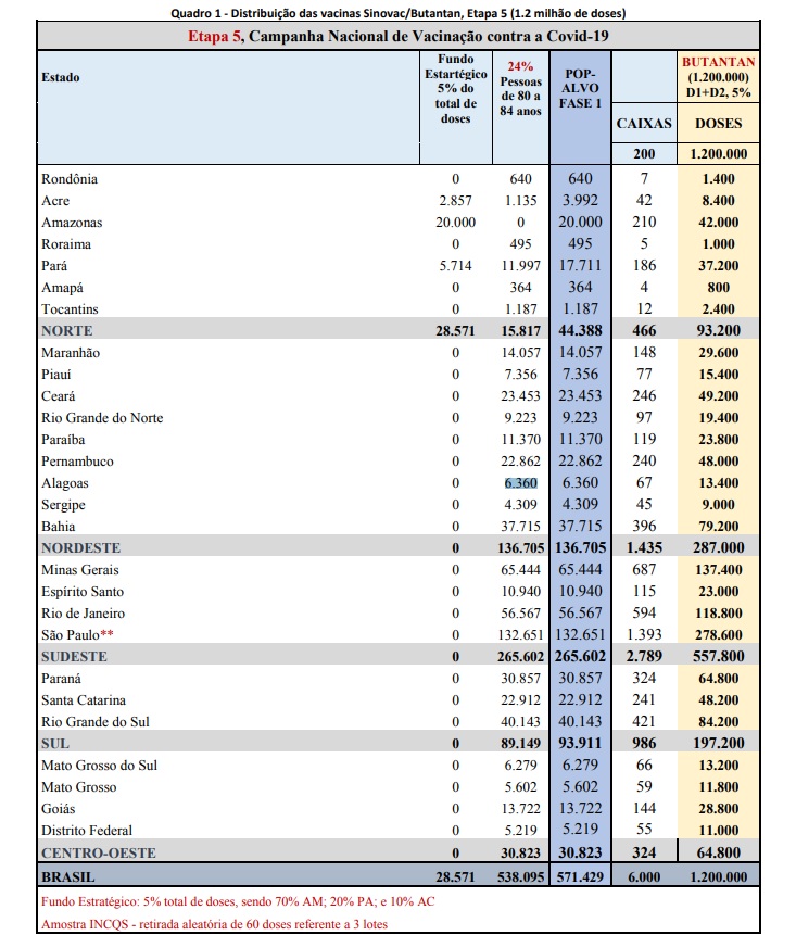 O Ministério da Saúde publicou nesta quarta-feira, 24, o cronograma com a quantidade de novas doses das vacinas contra a Covid-19 que serão distribuídas para os estados brasileiros. Segundo o documento do ministério, Alagoas vai receber 37.400 doses, sendo 13.400 CoronaVac/Butantan e 24.000 doses da Fiocruz/AstraZeneca.