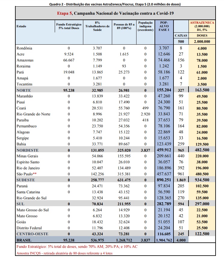 A pasta do Governo Federal está dando início à distribuição de mais 3,2 milhões de doses de vacinas contra a Covid-19 para ampliar a vacinação no Brasil entre o fim de fevereiro e o início de março. Todos os estados e Distrito Federal começam a receber 2 milhões de doses da vacina da AstraZeneca/Oxford, importadas da Índia, e 1,2 milhões de doses do imunizante do Instituto Butantan.