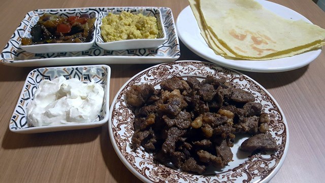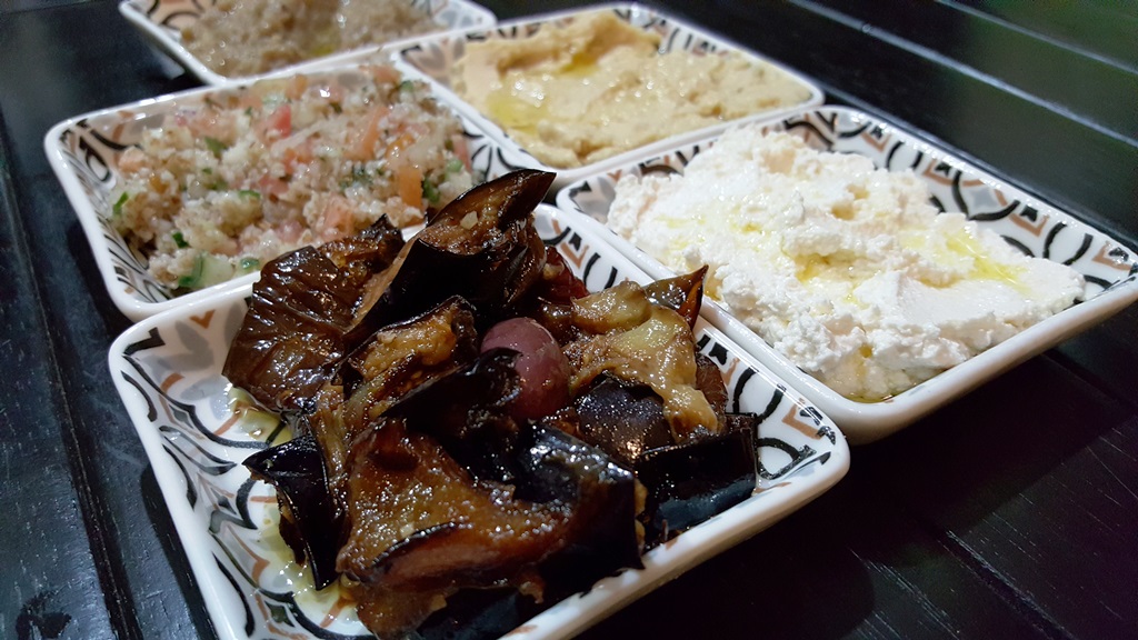 Carne de cordeiro com coalhada, homus, capponata e pão árabe