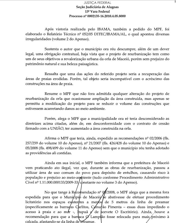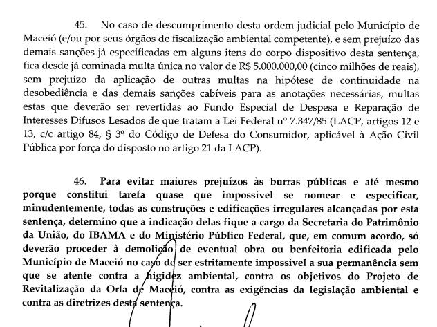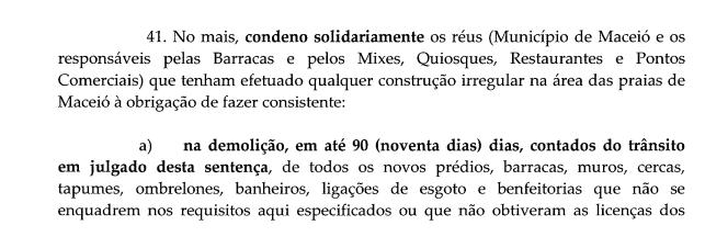 Na decisão (veja aqui), a Justiça alega que, à época da ação, a Prefeitura de Maceió e os donos dos estabelecimentos não estavam seguindo o projeto de reurbanização previsto para a Orla Marítima da capital e que várias irregularidades foram detectadas ao longo da faixa litorânea, entre elas, o tamanho de algumas barracas e o aumento de área construída na orla.