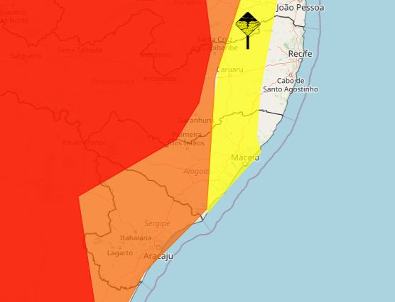 Os outros dois alertas têm validade até às 23h59 deste sábado (28). O amarelo, de perigo potencial, foi divulgado para Maceió e região, com cidades da Zona da Mata e do Litoral Sul inseridos no aviso meteorológico. Já o laranja, considerado de perigo, foi emitido para os municípios do Sertão, Agreste e Baixo São Francisco.
