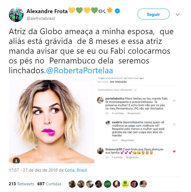 Em seu perfil no Twitter, ele disparou, juntamente com o print do comentário do fã-clube em questão: “Atriz da Globo ameaça a minha esposa, que aliás está grávida de 8 meses e essa atriz manda avisar que se eu ou Fabi colocarmos os pés no Pernambuco dela seremos linchados”.
