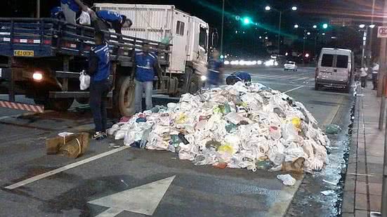 Uma imagem capturada na avenida mostra os alimentos despejados em forma de montanha sobre a pista, enquanto funcionários da PBH os recolhem e colocam em um caminhão de apoio.