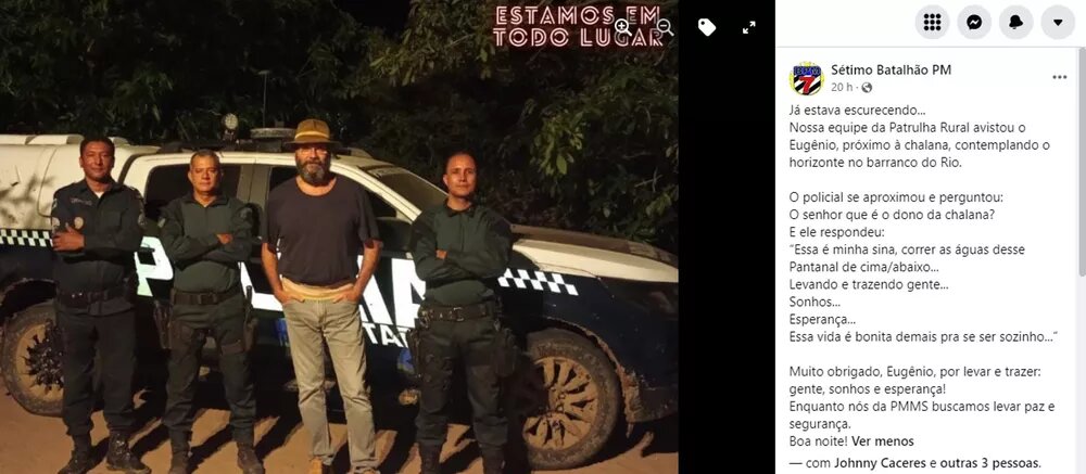 "Já estava escurecendo... Nossa equipe da Patrulha Rural avistou o Eugênio, próximo à chalana, contemplando o horizonte no barranco do Rio. O policial se aproximou e perguntou: - O senhor que é o dono da chalana? E ele respondeu: 'Essa é minha sina, correr as águas desse Pantanal de cima/abaixo... Levando e trazendo gente... Sonhos... Esperança... Essa vida é bonita demais pra se ser sozinho...'. Muito obrigado, Eugênio, por levar e trazer: gente, sonhos e esperança! Enquanto nós da PMMS buscamos levar paz e segurança". Veja o post abaixo.