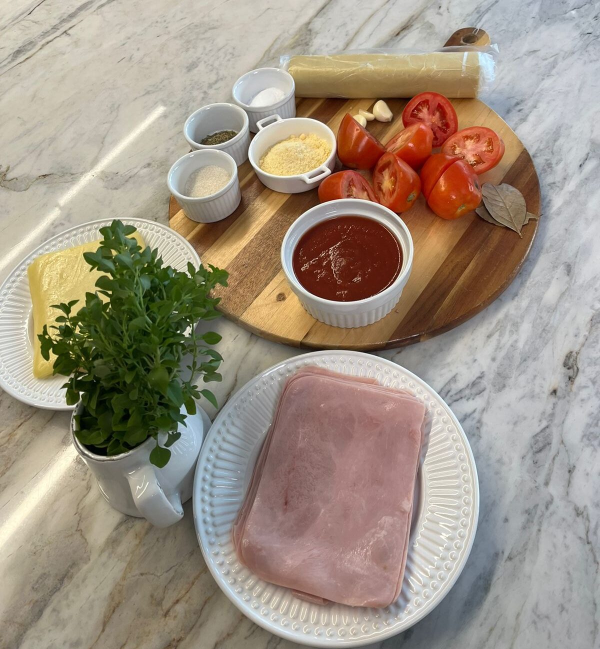 Agora chegou a hora do Rondelli. Abra a massa sobre uma mesa, coloque um pouco de molho de tomate. Adicione uma camada de presunto, outra camada de queijo e enrole a massa recheada. Corte em rodelas de média de 2 dedos de largura. Num refratário, coloque uma quantidade generosa de molho, coloque as rodelas do Rondelli e cubra com o restante do molho. Polvilhe queijo ralado e leve para gratinar em forno a 180º graus. Decore com folhas de manjericão e se delicie com toda a família.