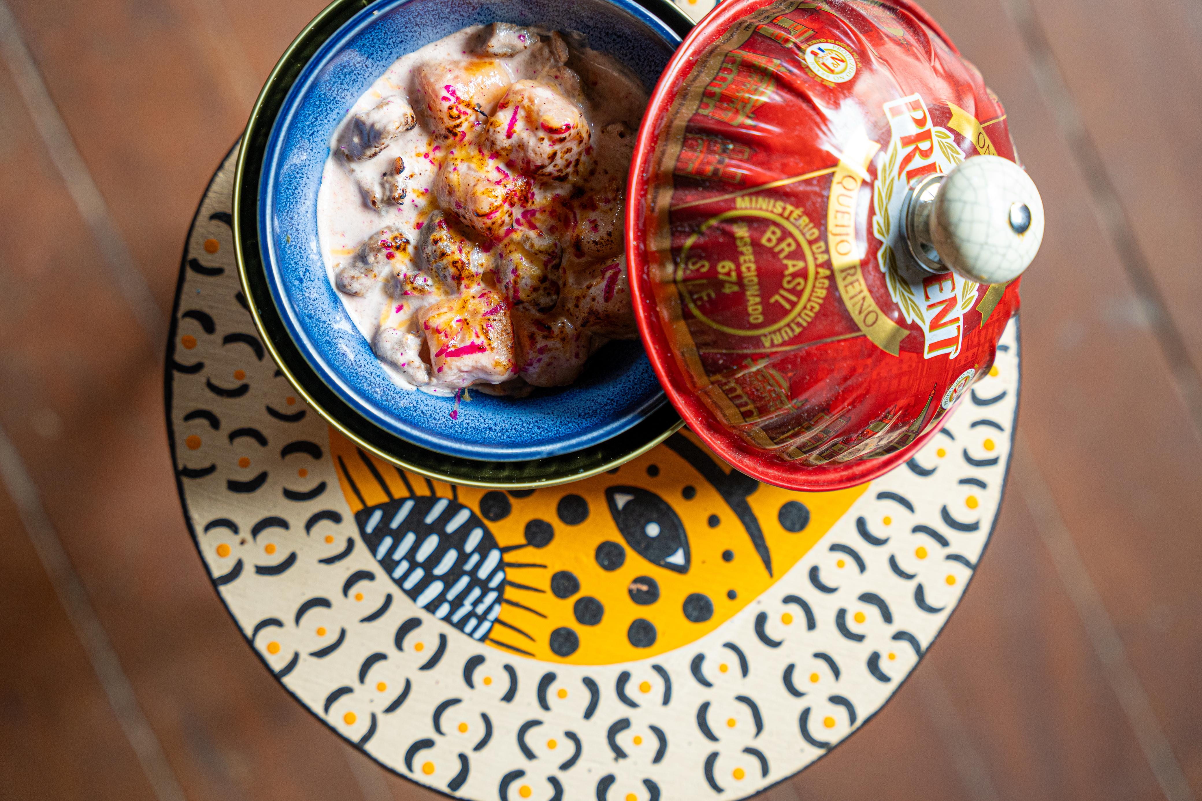 A segunda opção de prato principal é criação do chef Thiago: Nhoque de batata com carne de sol e queijo, minha predileta. A comida vem servida na lata de queijo do reino, que seria descartada, mas o chef transformou em objeto de arte.