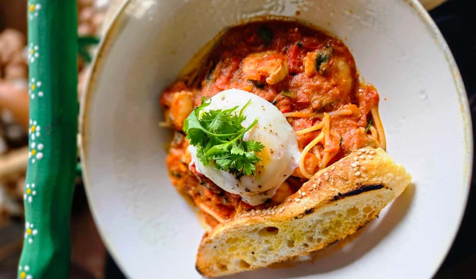 No prato principal, a Macarronada da Nide, com molho de tomate da casa, camarão e caldo do crustáceo. O ovo é uma homenagem às tradicionais macarronadas alagoanas, que sempre usam a proteína — e o chef Thiago ainda acrescentou uma fatia de pão, porque, afinal, sou a louca do pão.