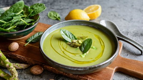 Junte o espinafre e cozinhe por mais 2 minutos. Desligue o fogo, aguarde amornar e transfira a mistura para um liquidificador. Bata até obter uma sopa cremosa. Volte para a panela e tempere com sal. Finalize com o suco de limão e um fio de azeite de oliva. Sirva em seguida.