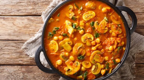 Após, acrescente o leite de coco e a água quente. Misture até obter um molho homogêneo de cor alaranjada intensa. Adicione os cogumelos fatiados e cozinhe por cerca de 5 minutos em fogo médio, até que fiquem macios e absorvam o sabor do molho. Depois, incorpore o grão-de-bico cozido, tempere com sal, pimenta-do-reino e açúcar. Cozinhe por mais 5 minutos para que os sabores se integrem. Por último, adicione o espinafre fresco e misture delicadamente até que murche no calor do preparo. Finalize com salsinha picada e sirva ainda quente.