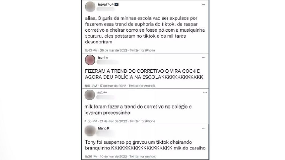 Nos vídeos, os alunos aplicam o corretivo na carteira da sala de aula, raspam, e inalam o pó por meio do tubo da caneta. Nas redes sociais, alguns estudantes relatam que os colegas foram expulsos depois de fazerem a chamada “trend do corretivo”. “Fizeram a trend do corretivo e agora deu polícia na escola”, escreveu um estudante.
