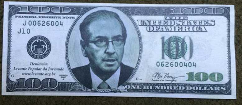 Cédula com o rosto de Cunha usada em protesto contra o presidente da Casa nesta quarta-feira (4)
