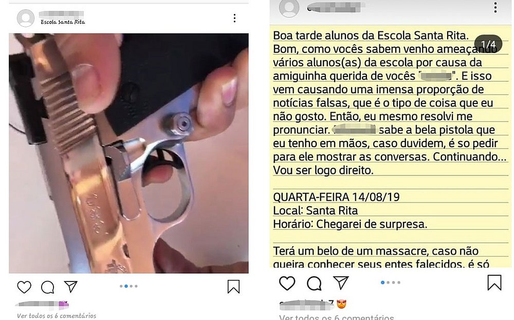 A ameaça em um perfil é clara: “Terá um belo massacre”. O pânico também: “Estamos apavorados”, disse a mãe de um aluno. As postagens de uma conta no Instagram, inclusive a imagem de uma mão segurando uma pistola, vem aterrorizando alunos, professores e outros funcionários da Escola Municipal Santa Rita, no bairro de Luís Anselmo, em Salvador. O autor fez três postagens e em uma delas diz que chegará de surpresa.