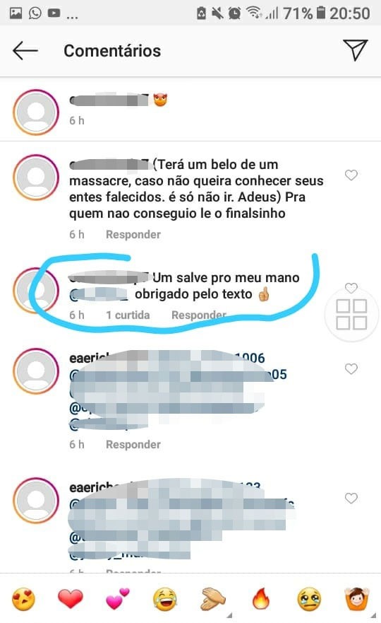 Logo abaixo, o autor diz o dia (14) e local do ataque (a escola) e dá detalhes de como possivelmente agirá: “Chegarei de surpresa”. Nos comentários, ele emenda o recado: “Terá um belo de um massacre, caso não queira conhecer seus entes falecidos, é só não ir. Adeus”.