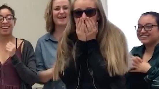 Quando os colegas de Allen a surpreenderam com os óculos, ela não conseguiu conter a emoção.