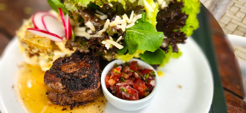 Salada com filé mignon, mostarda dijon e vinagrete