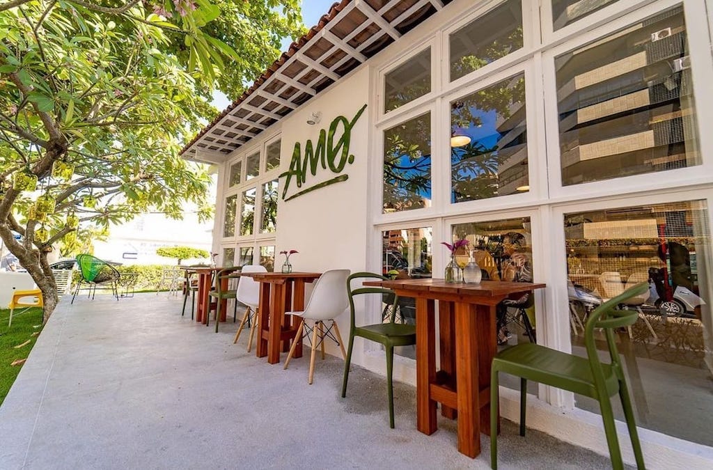 Nem sempre um monte de folhinhas verdes conquistam nosso coração. Mas desde 2018, Amo Crepes e Saladas (@amocrepesesaladas) vem mudando nossa opinião. Fazia um tempão que não aparecia por lá, voltei ao novo endereço, na Ponta Verde, e amei. O restaurante é uma casa com jardim muito aconchegante que abraça a gente. Um lugar gostoso de ficar! Além das folhas, podenos escolher uma proteína, como carne, peixe, camarão, frango… A de filé mignon, com salada de batata, ovo, mostarda dijon, vinagrete e mix de folhas é maravilhosa! Também tem proposta vegana com mix de cogumelos, arroz negro, castanha do pará caramelada, humus e rúcula.