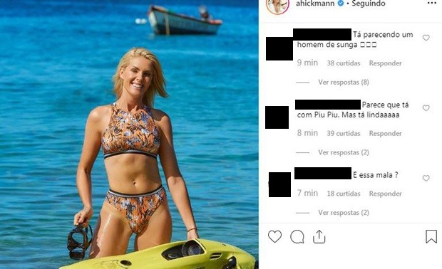 "Saudades deste lugar", escreveu a loira, que chamou a atenção por conta da peça de baixo do look. "Tá parecendo um homem de sunga", escreveu um rapaz. "Parece que tá com piu piu, mas tá linda", elogiou outra. Uma terceira elogiou Ana, mas criticou a peça. "Linda... mas não tá bonito essa parte de baixo".