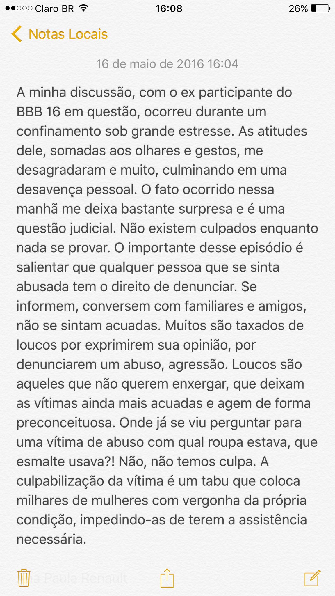 "A minha discussão, com o ex-participante do "BBB 16" em questão, ocorreu durante um confinamento sob grande estresse. As atitudes dele, somadas aos olhares e gestos, me desagradaram e muito, culminando em uma desavença pessoal. O fato ocorrido nessa manhã me deixa bastante surpresa e é uma questão judicial. Não existem culpados enquanto nada se provar", disse Ana Paula em nota.