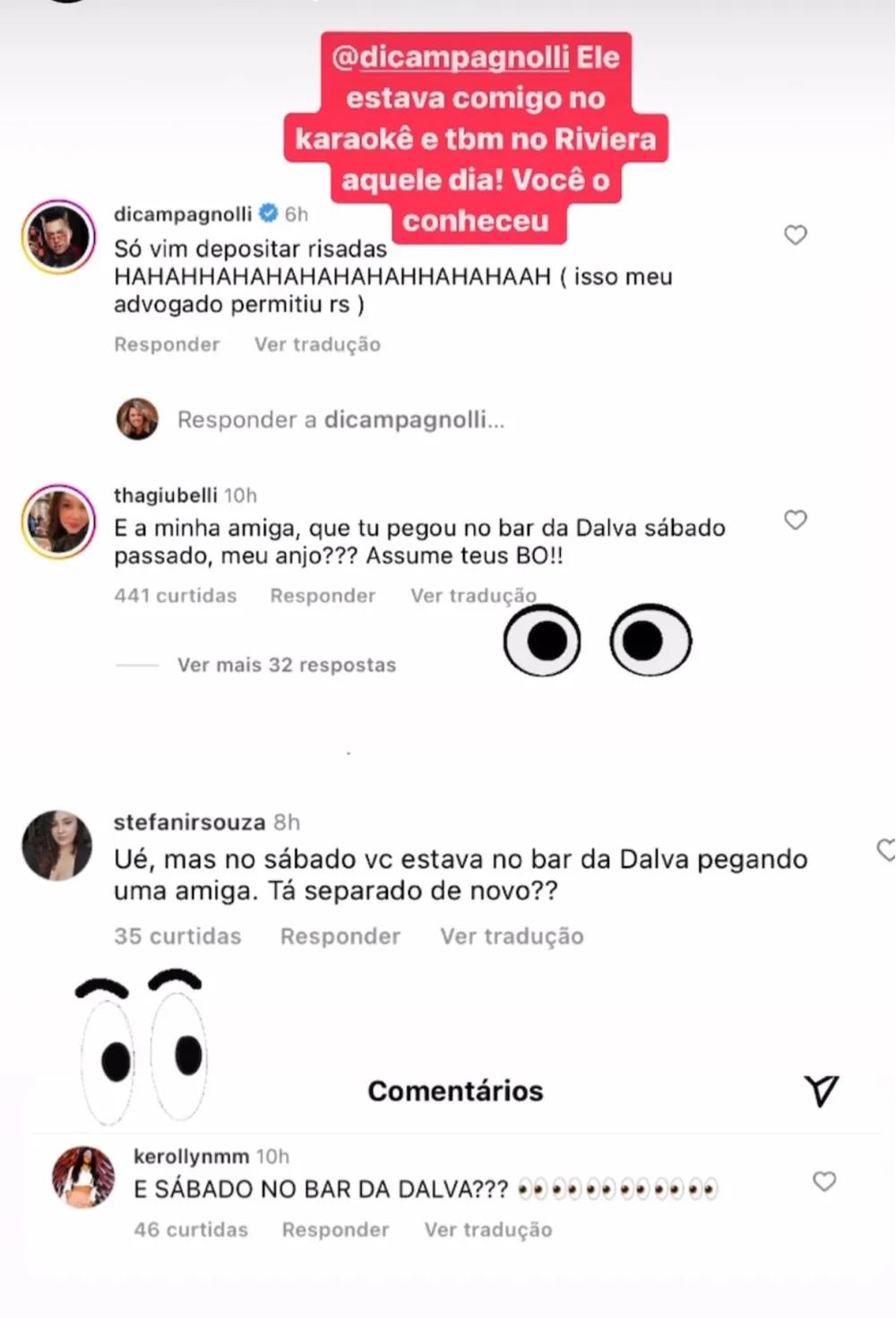 A ex-BBB expôs um print em que uma mulher afirma que a amiga ficou com Saul no bar no último sábado. Na mensagem, a moça diz: "E a minha amiga que tu pegou no bar da Dalva, sábado passado, meu anjo? Assume teus B.O".