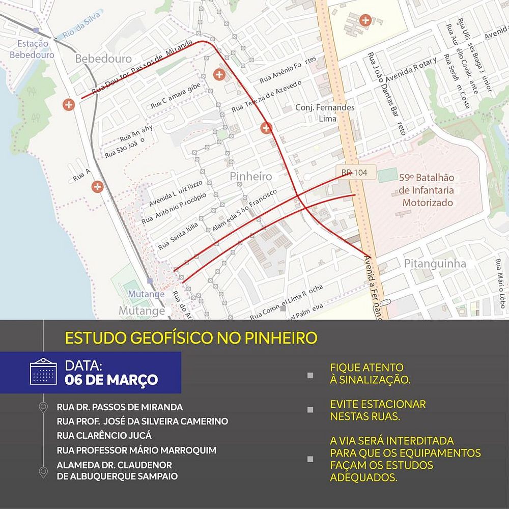 Equipes de pesquisadores do Serviço Geológico do Brasil (CPRM) e de empresa de geofísica mantiveram o trabalho no Pinheiro durante o Carnaval. A análise do subsolo pelos métodos audiomagnetotelúrico (AMT) e mapeamento das estruturas geológicas já alcançou 43% das áreas a serem avaliadas – o que equivale a 45 pontos em todo bairro –, e continua até o dia 10 de março, data prevista para conclusão dos levantamentos.