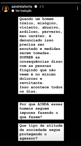Quando um homem tóxico, misógino, violento, abusivo, ardiloso, perverso, mau caráter é denunciado isso precisa ser escutado e medidas serem tomadas. SOFRER as consequências disso com as pessoas fingindo que não veem é no mínimo doloroso e revoltante. Isso acontece todos os dias. Por que AINDA esses homens seguem impunes fazendo o que fazem? Que tipo de atitude da sociedade segue protegendo o agessor?", escreveu a artista nos stories do Instagram.