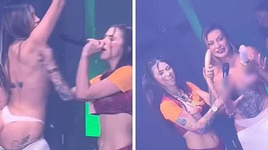 Em seguida, Urach e Pipokinha se beijaram. Nos stories de pessoas presentes na festa, é possível ver Pipokinha ajoelhada no palco enquanto beija a ex-Miss Bumbum.