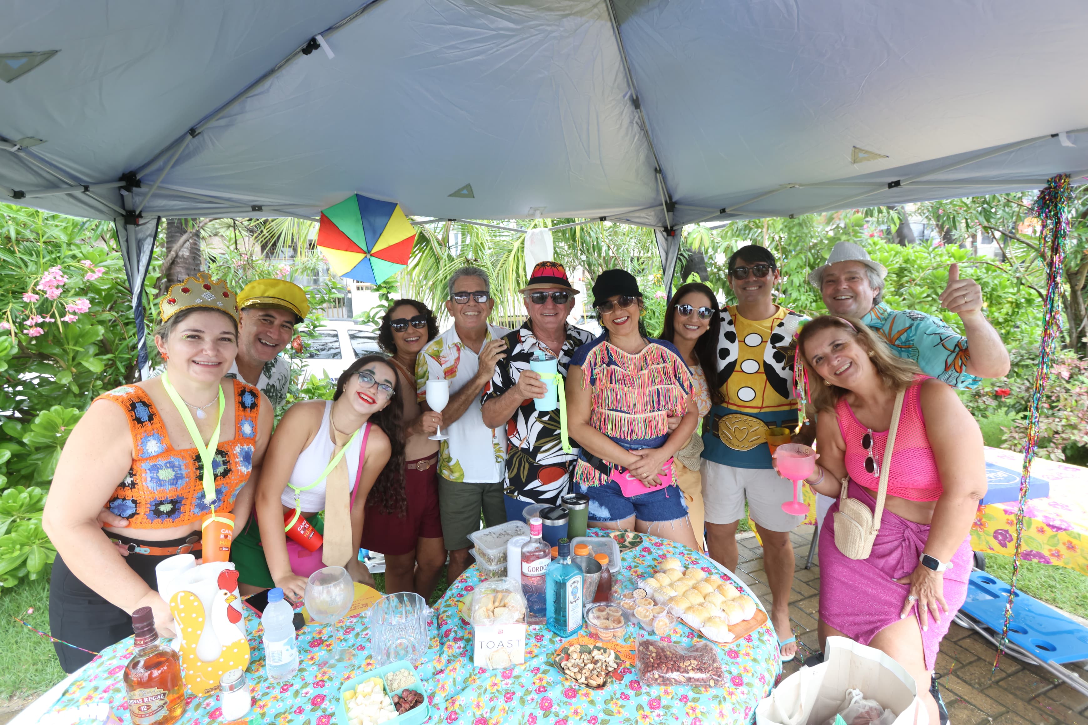 A advogada Elaine Anísio, de 47 anos, se organiza todos os anos com um grupo de amigos para cair na folia. Eles levam bebidas, salgadinhos e muita alegria para as prévias nas ruas. Esse ano, o grupo instalou uma tenda para proteção, tanto do sol quanto da chuva. "Aqui é um grupo de amigos do trabalho de uma vida de mais de 30 anos, porém todo carnaval há mais de 10 anos se organiza aqui para ver o Pinto passar. É um grupo que, como eu falei, se reuniu a maioria do trabalho, são quatro amigos, mas também familiares, e que todos os anos a gente se reúne. Cada ano tem uma inovação. Já fizemos camisas, já fizemos bloquinho, e esse ano a gente trouxe essa tenda e parece que foi providencial, porque esse ano está tendo a chuva, uma chuva mais forte. Aqui formam umas 20, 30 pessoas para ver o Pinto".