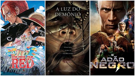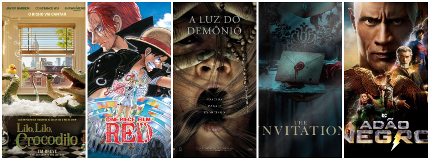 Na parte alta da cidade, ‘Lilo, Lilo, Crocodilo’, ‘One Piece Film: Red’ e ‘A Luz do Demônio’ são as estreias da semana. ‘Convite Maldito’, ‘Adão Negro’ e ‘As Aventuras de Tadeo e a Tábua de Esmeralda’ seguem disponíveis.