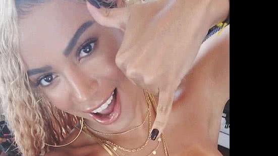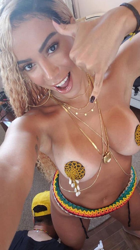 Anitta está com o cabelo loiro e abusou da sensualidade. Ela ficou quase sem roupa para as gravações em Salvador. Usando um biquíni de crochê minúsculo e com as cores do Olodum, a cantora deixou pouco para a imaginação e tampou apenas parte dos seios.