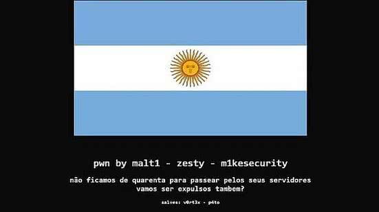 Ao clicar na página (formulario.anvisa.gov.br), aparece uma bandeira da Argentina com a seguinte frase: "não ficamos de quarenta (sic) para passear pelos seus servidores. vamos ser expulsos também?".
