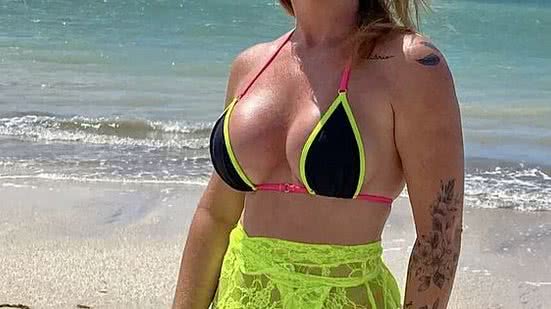 A influenciadora de 46 anos, elegeu um biquíni com cores misturadas entre preto, verde e rosa neon, além de uma saída de praia em renda verde bem chamativa. Para se proteger do sol, ela usou um chapéu de praia e óculos escuros.