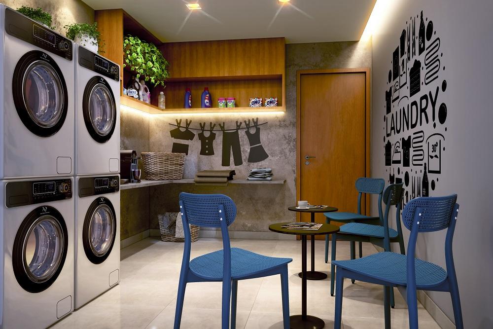 Espaços funcionais como a lavanderia têm ganhado ambientes próprios nas áreas comuns de novos empreendimentos. Foto: Studio Design 3 / Reprodução