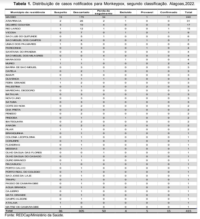 Após a confirmação do 15º caso de monkeypox, a varíola dos macacos, em Alagoas, a Secretaria de Estado da Saúde (Sesau) segue investigando 36 casos suspeitos da doença. O mais recente caso confirmado é de um paciente de Rio Largo. Os outros casos foram registrados em Maceió (11), Murici (2) e Viçosa (1). Até agora foram notificados 415 casos suspeitos de varíola dos macacos no estado, dos quais 305 foram descartados. Foram excluídos 04 casos por não atenderem definição proposta pelo Ministério da Saúde dos seguintes municípios: Arapiraca, Pindoba, Maragogi e Viçosa. Veja o boletim completo.