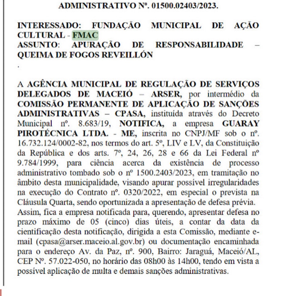 Mais de 30 dias depois, a Prefeitura de Maceió notificou oficialmente a empresa responsável pela queima de fogos do réveillon no Jacintinho, por causa de um acidente que deixou pessoas feridas durante a festa. No dia 2 de janeiro, a Fundação Municipal de Ação Cultural (FMAC) havia informado ao TNH1 que a empresa foi notificada, porém houve atraso de um mês para o procedimento ser oficializado.