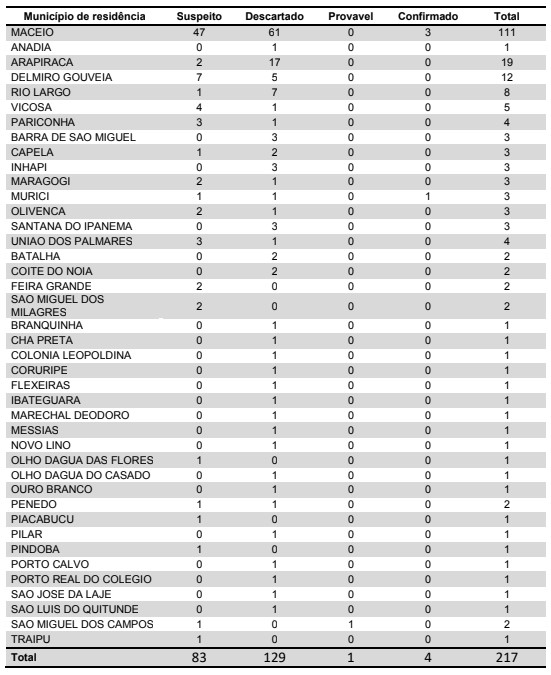 No que se refere aos casos positivos, todos são do sexo masculino, tendo como municípios de residência Maceió (03) e Murici (01), com idade de 37, 35 e 25 (02) anos, respectivamente. Veja o boletim completo.