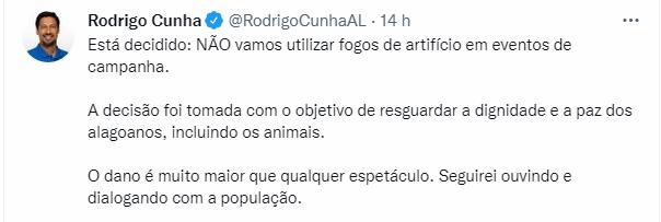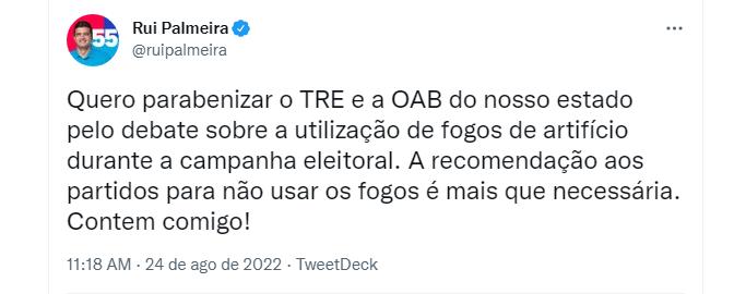 Rui Palmeira escreveu que a recomendação aos partidos para não usar os fogos é mais que necessária; veja: