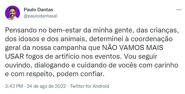 Paulo Dantas afirmou que foi determinado à coordenação geral da campanha a suspensão do uso de fogos de artifício nos eventos: