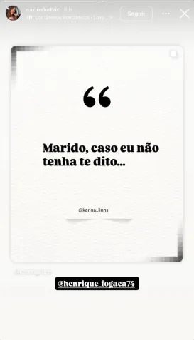 A engenheira química Carine Ludvic, esposa do chef de cozinha Henrique Fogaça, compartilhou um post nas redes sociais nesta quarta-feira (20) se declarando ao marido.