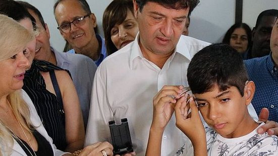 Eduardo França Gonçalves, 11 anos, tem deficiência auditiva desde 1 ano de idade e hoje (30) experimentou pela primeira vez o aparelho de audição que tinha pedido em uma cartinha encaminhada ao Papai Noel dos Correios. O garoto foi uma das 350 pessoas que receberam o equipamento no Centro de Saúde Auditiva Eurico Ângelo de Oliveira Miranda, do Hospital Dr. Moacyr Rodrigues do Carmo, em Duque de Caxias, Baixada Fluminense. Ao lado do prefeito Washington Reis, o ministro da Saúde, Luiz Henrique Mandetta, ajudou Eduardo a botar o aparelho que foi entregue pela prefeitura.