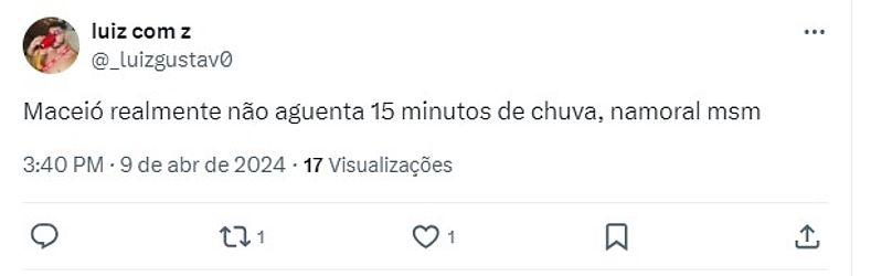 Nas redes sociais, moradores de diferentes locais de Maceió reclamaram do sistema de escoamento da cidade e da rapidez com que as ruas ficaram alagadas. Confira os prints abaixo: