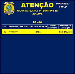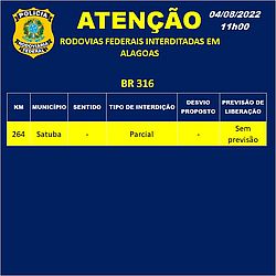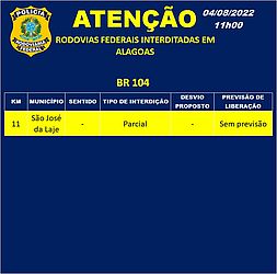 Já a BR-104, em São José da Laje, o quilômetro 11 também está com bloqueio parcial e os condutores devem passar com atenção.
