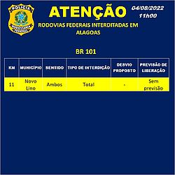 Em Novo Lino, o bloqueio do quilômetro 11,8 da BR-101 acontece nos dois sentidos, desde às 21h45 de quarta-feira, 3. A interdição aconteceu por causa do risco iminente de desmoronamento. Ainda de acordo com a polícia, as equipes vão trabalhar para a manutenção da rodovia e quem deseja seguir para Recife deve fazer o trajeto pela AL-101 Norte.