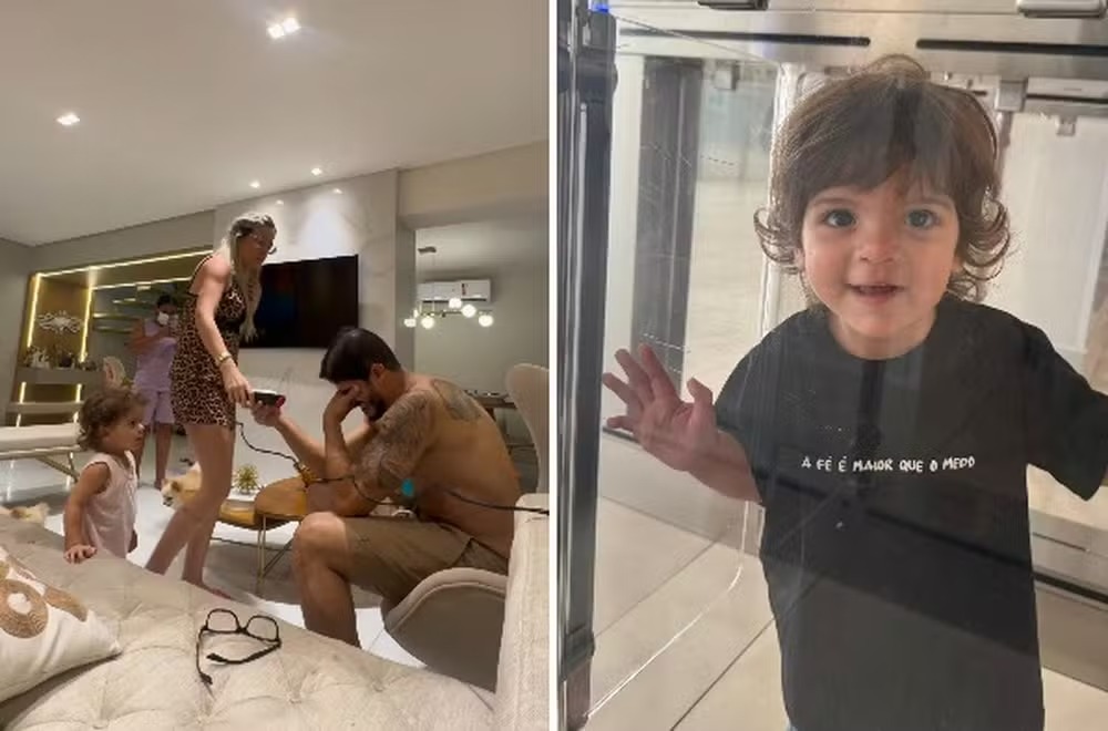 No vídeo publicado, Victor aparece sentado com uma máquina de cortar cabelo nas mãos, enquanto a menina o observa com curiosidade. A mãe se aproxima e o ajuda a raspar o restante do cabelo diante da filha.