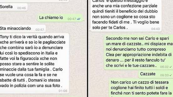 “Se o Carlo me tocar e me machucar, eu não vou esperar por nada. O rosto dele estará em todos jornais e eu publico tudo sobre isso, eu também vou denunciar você pelas ameaças e acusações destes último dias”, continuou ela, quando também acusou o sócio de ameaçá-la.