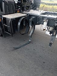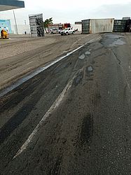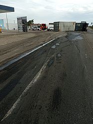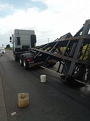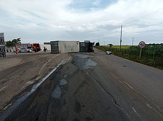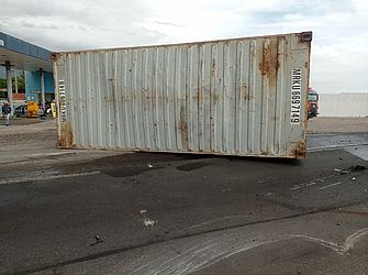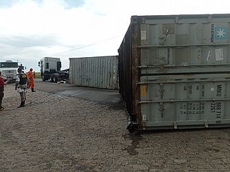 Com o deslocamento de um dos conteiners para o lado, os dois reboques do caminhão tombaram na pista. Por sorte, o caminhão não tombou e ninguém ficou ferido. Alguns objetos ficaram espalhados e a rodovia teve que ser interditada para a retirada dos conteiners.