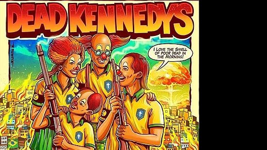 Pôster criado por Cristiano Suarez para a turnê de 40 anos dos Dead Kennedys no Brasil; imagem traz palhaço Bozo e sua família em frente a uma favela em chamas Cristiano Suarez Dead Kennedys divulga pôster de turnê de 40 anos no Brasil; imagem traz palhaço Bozo e sua família em frente a uma favela em chamas Nele, o palhaço Bozo e sua família vestem camisetas parecidas com a da seleção brasileira de futebol enquanto seguram armas em frente a uma favela em chamas. Tanques de guerra completam o cenário. "Eu adoro o cheiro de pobres mortos pela manhã", diz um dos personagens.