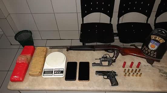 Os PMs também recolheram as duas armas de fogo, sendo uma espingarda de calibre 28 e um revólver de calibre 38, e um simulacro de pistola. Doze munições, dois celulares e uma balança de precisão também foram apreendidos.