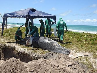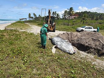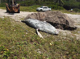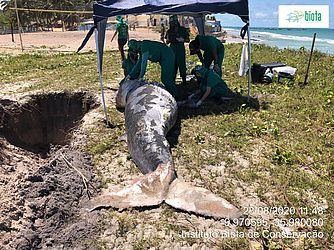 Encontrada encalhada e sem vida na tarde dessa quinta-feira (27) nas falésias de Jequiá da Praia, Litoral Sul de Alagoas, uma baleia jubarte foi examinada por uma equipe do Instituto Biota ao longo desta sexta-feira (28) e será enterrada em uma vala na própria praia.