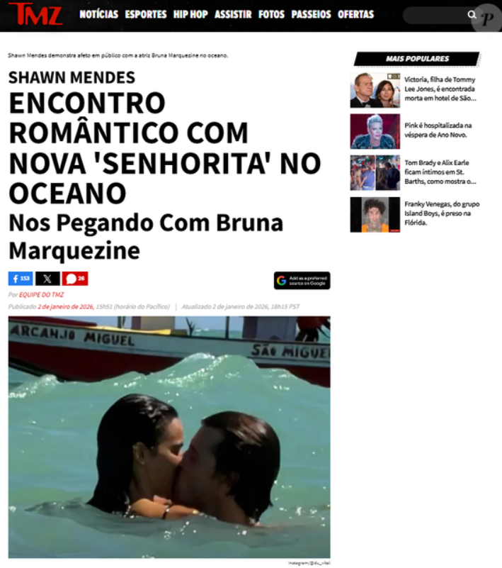 O namoro entre Bruna Marquezine e Shawn Mendes foi confirmado pelo TMZ, após o casal ser flagrado em momentos íntimos durante uma viagem a São Miguel dos Milagres, Alagoas, atraindo a atenção da mídia internacional.